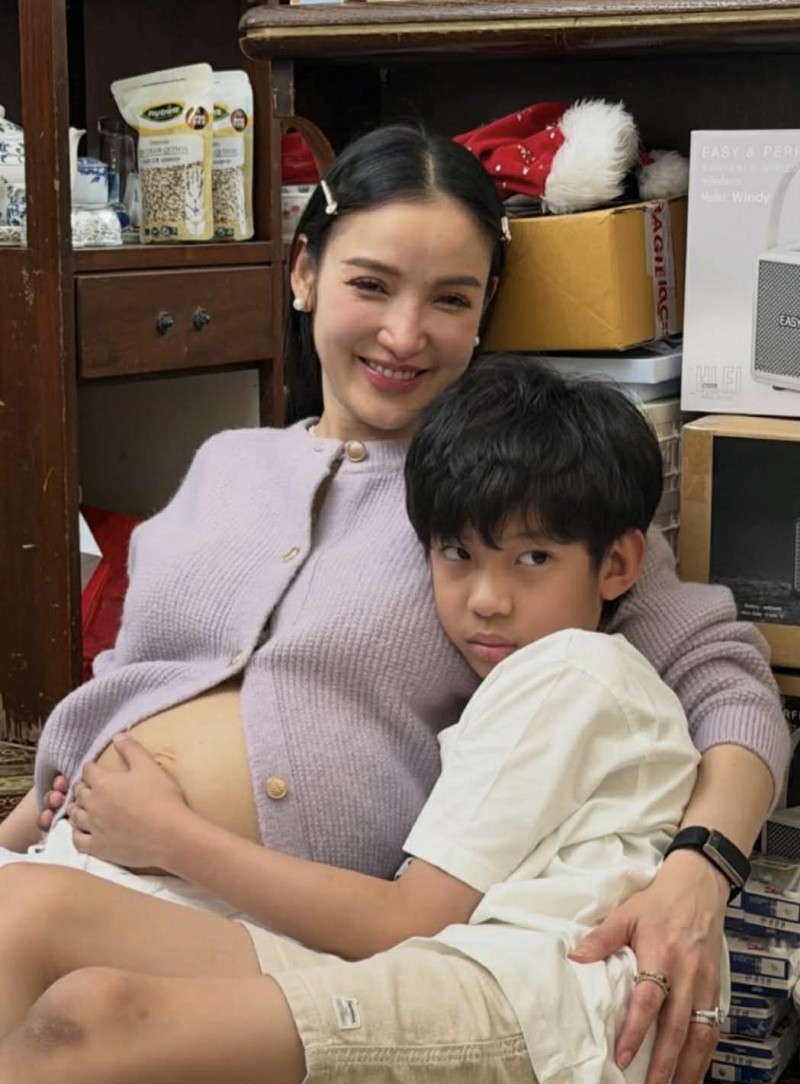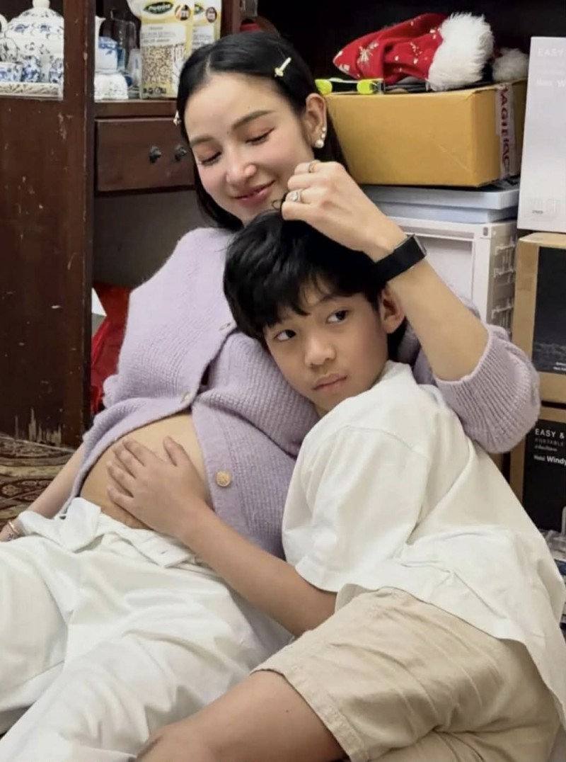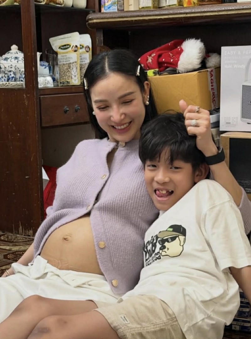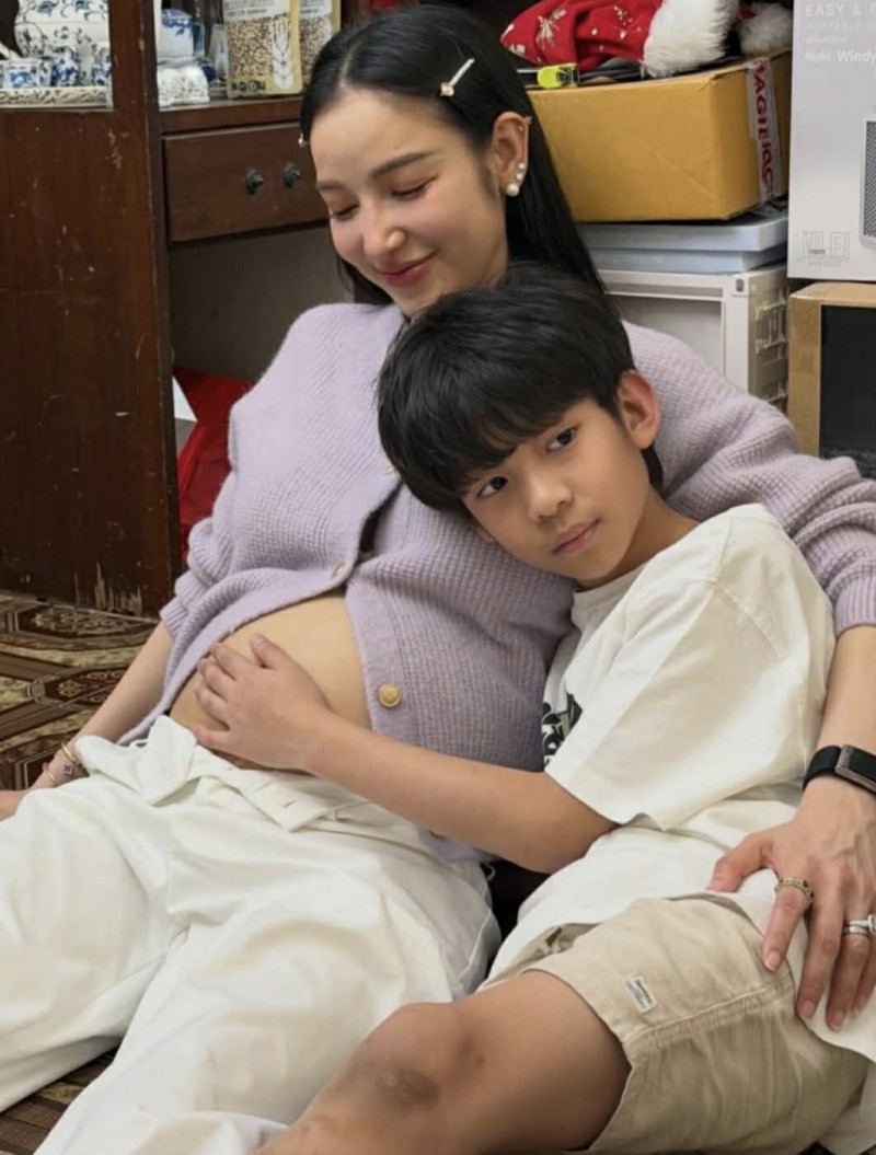 ล่าสุดมีภาพโมเมนต์สุดอบอุ่น เมื่อ น้องเรซซิ่ง ลูกชายคนโต เข้ามาโอบกอดท้องคุณแม่อย่างอ่อนโยน