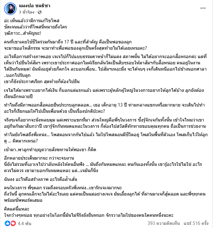 เรียกได้ว่า เป็นประเด็นดราม่าเดือดต่อ หลังภรรยา เหน่ง เหม่งจ๋าย ออกมาโพสต์ฟาดถึงใครบางคน โดยล่าสุก ทางนักร้องสาว อย่าง แมงปอ ชลธิชา ได้ออกมาโพสต์ปกป้อง เจเจ อดีตภรรยาของเหน่ง โดยเผยว่า อ่ะ เห็นแล้วว่ามีการแก้ไขโพส ชัดเจนแล้วว่าที่โพสนี่หมายถึงใคร วุฒิภาวะ...สำคัญนะ! คนที่เขาเคยใช้ชีวิตร่วมกันมาถึง 17 ปี และที่สำคัญ คือเป็นพ่อของลูก จะมาขออโหสิกรรม จะมาทำเพื่อพ่อของลูกเป็นครั้งสุดท้ายไม่ได้เลยเหรอคะ?