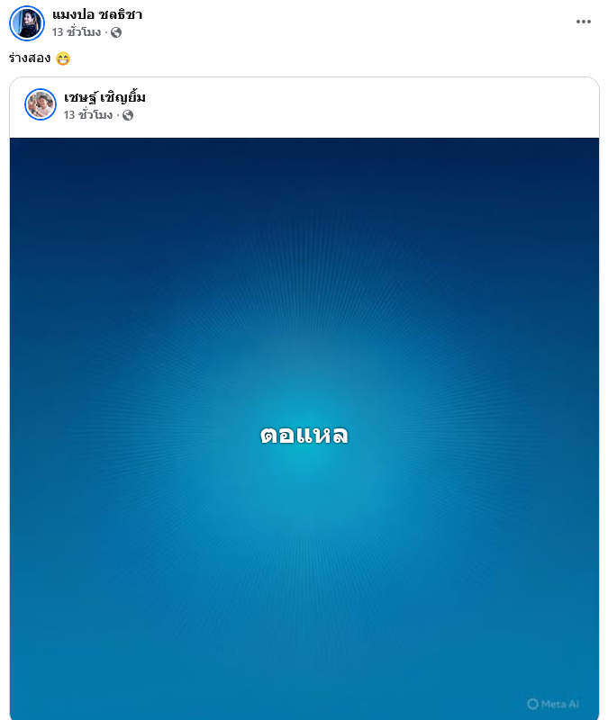 และก่อนหน้าสนั้น ยังได่แชร์โพสต์ของ เชษฐ์ เชิญยิ้ม พร้อมใส่แคปชั่นว่า ร่างสอง