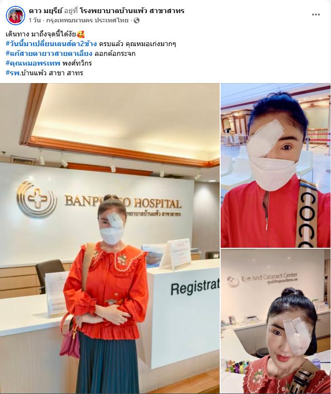 โดย ดาว มยุรีย์ ได้ออกมาแจงสาเหตุที่แท้จริงว่า ได้มาเปลี่ยนเลนส์ตา2ข้าง เพื่อแก้สายตายาวสายตาเอียง ลอกต้อกระจก และยังได้ชมไปถึงคุณหมอว่าเก่งมากๆด้วย