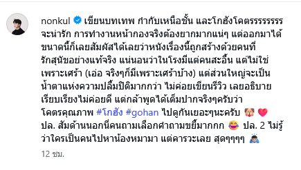 ทำเอาแฟนคลับอมยิ้มไปตามๆ กัน เมื่อล่าสุด นนกุล ชานน ได้ออกมาโพสต์ความประทับใจที่มีต่อภาพยนตร์โกฮัง(Gohan) ผลงานที่คนรักสุนัขไม่ควรพลาด ระบุว่า เขียนบทเทพ กำกับเหนือชั้น และโกฮังโคตรรรรรรรรจะน่ารัก การทำงานหน้ากองจริงต้องยากมากแน่ๆ
