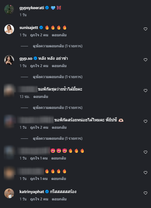 ท่ามกลาง เพื่อนๆและแฟนคลับ ต่างเข้ามาคอมเมนต์กันจำนวนมาก เช่น ภาพ behind the scene คือ การปัดผมที่รุนแรงมาก,สวยจังครับยิปซีสวยมากกกกครับ ,คุ้มค่ากับกาคอาบแดดดดแล้ววววว คถ ทะเลอีกแล้วอ่าาาาา ,หลัง หลัง อย่าซ่า เป็นต้น