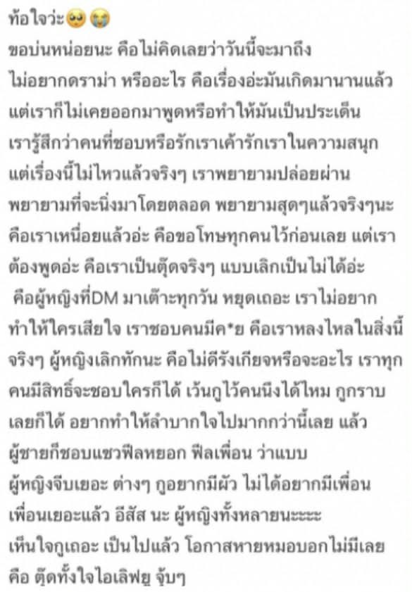 โดย เจ้าตัว เล่าว่า ที่ผ่านมาเลือกจะนิ่ง และปล่อยผ่านมาตลอด แต่สุดท้ายก็อยากชี้แจงให้ชัด เพื่อไม่ให้เกิดความเข้าใจผิด เฉพาะกับสาวๆ ที่ทักมาหยอดอยู่เป็นประจำ