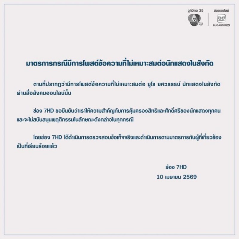 ล่าสุดทางช่อง 7 ได้ออกมาแถลงการณ์ทันทีว่า มาตรการกรณีมีการโพสต์ข้อความที่ไม่เหมาะสมต่อนักแสดงในสังกัด ตามที่ปรากฏว่ามีการโพสต์ข้อความที่ไม่เหมาะสมต่อ ยูโร ยศวรรธน์ นักแสดงในสังกัดผ่านสื่อสังคมออนไลน์นั้น