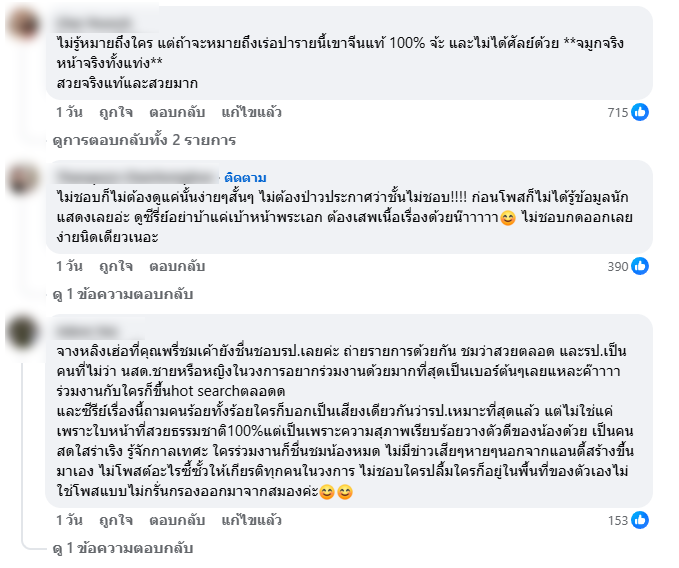 งานนี้ ทำเอาแฟนๆที่คิดว่าหมายถึง ตี๋ลี่เร่อปา หรือเปล่านั้น ต่างเข้ามาคอมเมนต์กันเพียบ เช่น เรื่องตลกคืออะไรรู้ป้ะ คือเพิ่งมีลูกครึ่งไทย-เบลเยี่ยม อย่างใหม่ ดาวิกาไปเดบิวท์ในซีรีส์พีเรียดจีน ดูแล้วขัดใจด้วยป้ะ เร่อปานี่จีนแท้ด้วยซ้ำ ส่วนดาราไทยคนนั้นอะลูกครึ่งแท้เลย 5555555555555555555,ไม่รู้ว่าคุณหมายถึงใคร ถ้าหมายถึงเร่อปา....ชั้นข้ามกำแพงมา7ปีเพราะนางค่ะ,ไม่รู้หมายถึงใคร แต่ถ้าจะหมายถึงเร่อปารายนี้เขาจีนแท้ 100% จ้ะ และไม่ได้ศัลย์ด้วย **จมูกจริงหน้าจริงทั้งแท่ง** สวยจริงแท้และสวยมาก อย่างไรก็ตาม ทางต้นหอมเองก็ไม่ได้ระบุว่าเป็นใครนั้นเอง