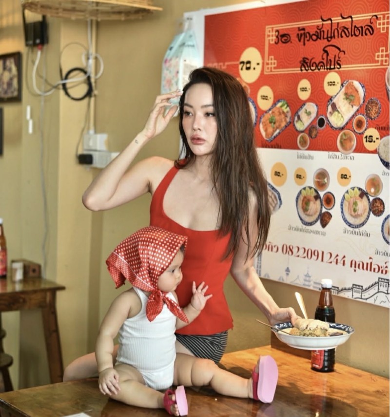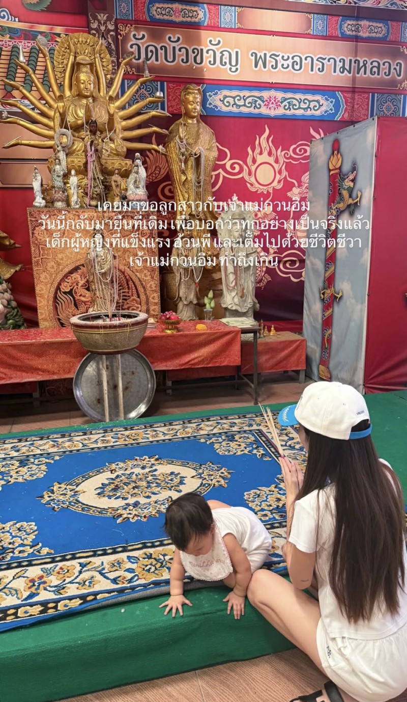 โดย เธอ เล่าว่า เคยตั้งใจขอลูกสาวกับเจ้าแม่กวนอิม และวันนี้ได้กลับมายืนที่เดิม พร้อมลูกน้อยที่เกิดมาแข็งแรง สดใส สมความตั้งใจทุกอย่าง