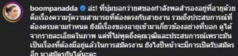 ด้าน บุ๋ม ไม่ปล่อยให้คาใจ รีบออกมาชี้แจงว่า ตำแหน่งที่ได้รับคือ กำลังพลสำรอง ซึ่งมีการเปิดรับมาหลายรุ่นแล้ว พร้อมเผยว่า เธอ ตัดสินใจสมัครเพราะอยากทำประโยชน์ให้ประเทศก่อนอายุ 50 ปี