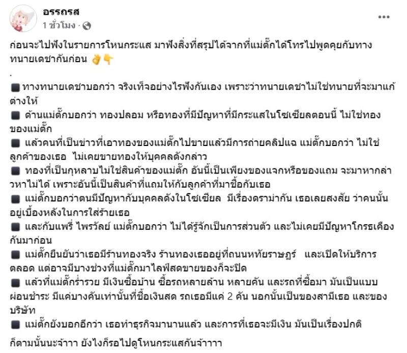 ล่าสุด ทนายเดชา ได้ออกมาพูดหลังแม่ตั๊กได้โทรมาคุยด้วยแล้ว โดยเพจดัง อย่าง อรรถรส ได้เผยข้อสรุปว่า