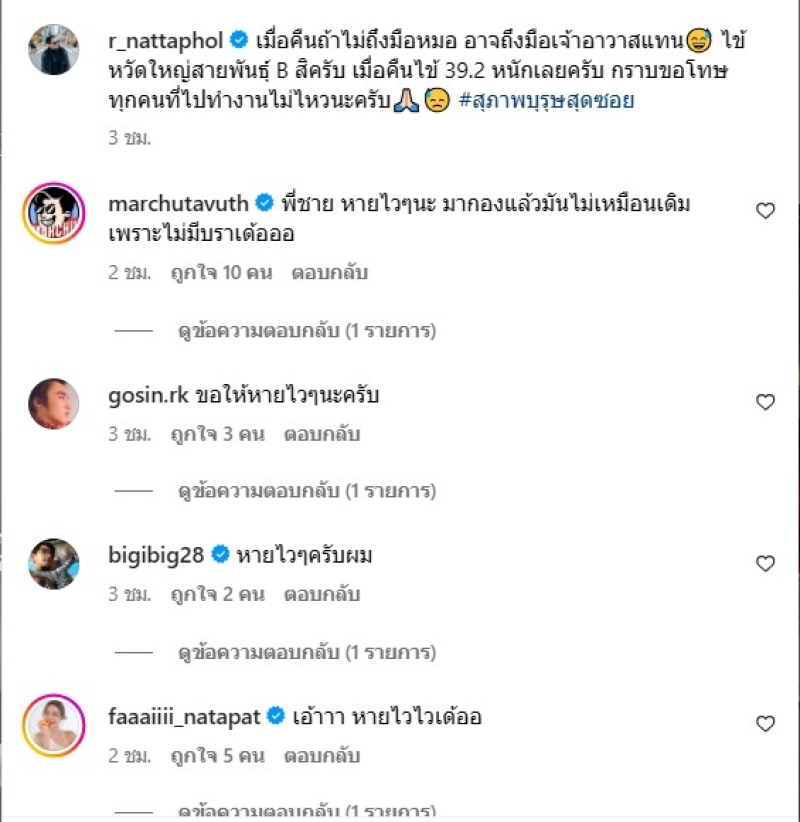 เรียกได้ว่า เป็นนักร้องหนุ่ม-ดารา อย่าง อาร์ เดอะสตาร์ ที่มีผลงานมากมายในวงการ ล่าสุด ได้โพสต์ผ่านทางอินสตาแกรม โดยได้เข้าโรงพยาบาล พร้อมระบุข้อความว่า เมื่อคืนถ้าไม่ถึงมือหมอ อาจถึงมือเจ้าอาวาสแทน ไข้หวัดใหญ่สายพันธุ์ B สิครับ เมื่อคืนไข้ 39.2 หนักเลยครับ กราบขอโทษทุกคนที่ไปทำงานไม่ไหวนะครับ #สุภาพบุรุษสุดซอย