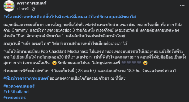 เรียกได้ว่าเป็นอีกหนึ่งเรื่องเศร้าของวงการบันเทิงสำหรับการสูญเสียของ ป๊อป จักรกฤษณ์ มัฆนาโส โปรดิวเซอร์มือทอง ผู้สร้างผลงานเพลงละครช่อง 3 ได้จากไปอย่างสงบ โดยทางด้านเพจ ดาราภาพยนตร์ ได้ออกมาโพสต์ว่า