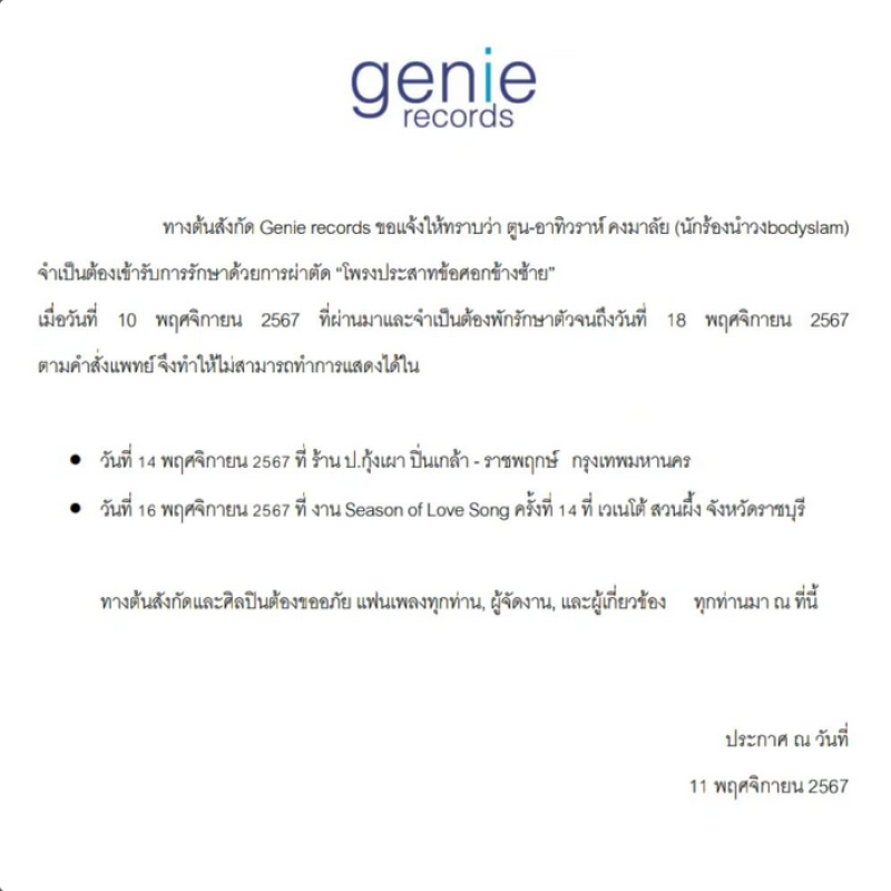 จากกรณีที่ก่อนหน้านี้ ตูน บอดี้สแลม หรือ ตูน อาทิวราห์ ทางค่ายจีนี่ เรคคอร์ด ได้ร่อนจดหมายประกาศการพักงานของ ตูน บอดี้สแลม เพื่อไปพักรักษาตัว โดย ตูน ก็ได้โพสต์ข้อความลงไอจี พร้อมข้อความระบุว่า ต้องขอโทษทุกๆ คนจริงๆ ครับที่ไม่สามารถขึ้นเวทีได้ในช่วงหนึ่งอาทิตย์ต่อจากนี้ ตามคำแนะนำของแพทย์ที่ทำการผ่าตัดให้ผมในครั้งนี้