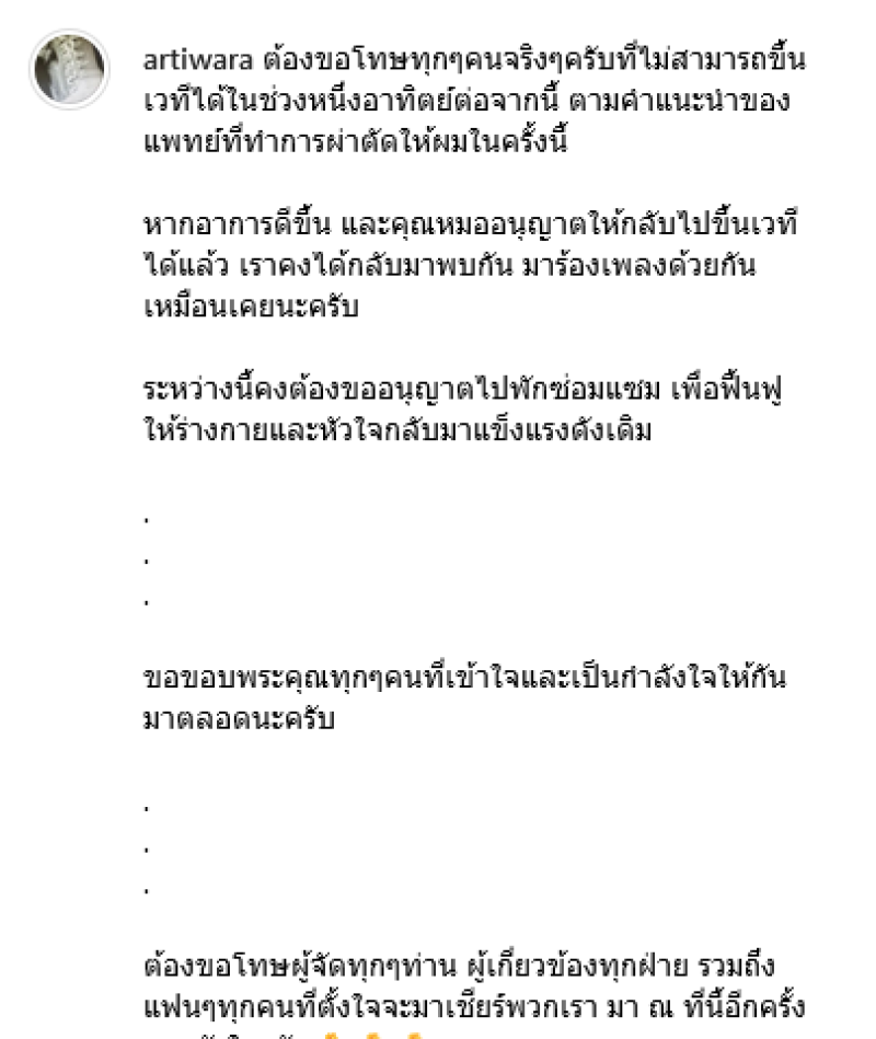 หากอาการดีขึ้น และคุณหมออนุญาตให้กลับไปขึ้นเวทีได้แล้ว เราคงได้กลับมาพบกัน มาร้องเพลงด้วยกันเหมือนเคยนะครับ ระหว่างนี้คงต้องขออนุญาตไปพักซ่อมแซม เพื่อฟื้นฟูให้ร่างกายและหัวใจกลับมาแข็งแรงดังเดิม ขอขอบพระคุณทุกๆ คนที่เข้าใจและเป็นกำลังใจให้กันมาตลอดนะครับ รัก ตูน, อาทิวราห์ คงมาลัย 11 พ.ย. 2567