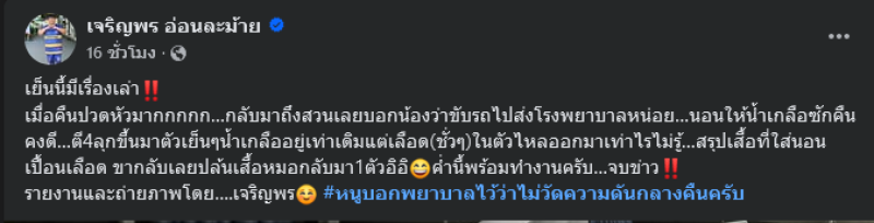เรียกได้ว่าเป็นอีกหนึ่งนักแสดงตลกดังสำหรับ โก๊ะตี๋ อารามบอย ที่ล่าสุดเมื่อวันที่ 23 ธ.ค. 67 ที่ผ่านมา โก๊ะตี๋ ได้โพสต์เล่าอาการป่วยจนต้องให้น้องขับรถพาไปส่งที่โรงพยาบาล และได้นอนให้น้ำเกลือแต่ได้ตื่นมากลางดึก เจอเลือดเต็มเตียง เหตุเพราะจากสายน้ำเกลือหลุด ผ่านเฟซบุ๊ค เจริญพร อ่อนละม้าย โดยเล่าว่า