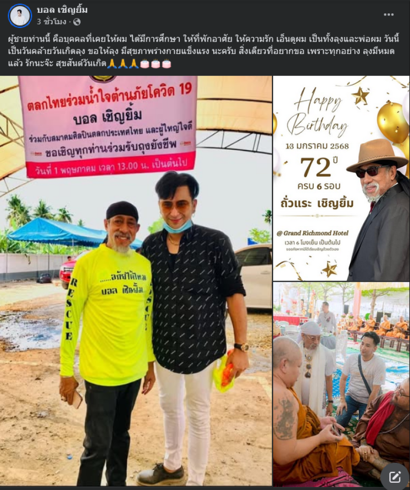 โดย บอล เชิญยิ้ม ได้โพสต์ข้อความอวยพรวันเกิดผ่านทางเฟซบุ๊ค บอล เชิญยิ้ม ระบุว่า ผู้ชายท่านนี้ คือบุคคลที่เคยให้ผม ได้มีการศึกษา ให้ที่พักอาศัย ให้ความรัก เอ็นดูผม เป็นทั้งลุงและพ่อผม วันนี้เป็นวันคล้ายวันเกิดลุง ขอให้ลุงมีสุขภาพร่างกายแข็งแรงนะครับ สิ่งเดียวที่อยากขอ เพราะทุกอย่างลุงมีหมดแล้ว รักนะจ๊ะ สุขสันต์วันเกิด