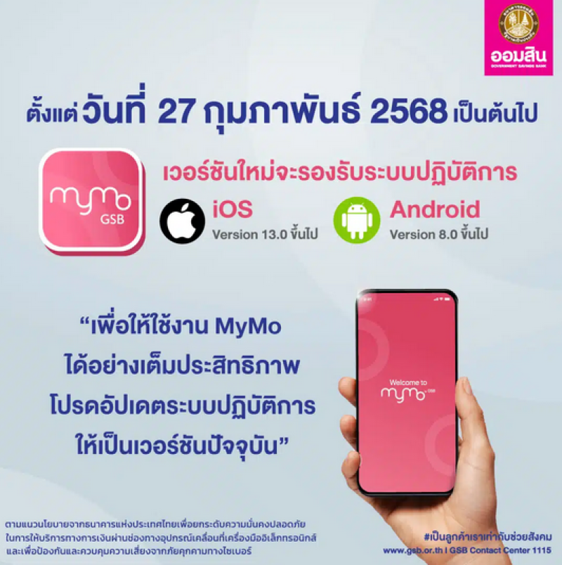 วันที่ 27 มกราคม 2568 ธนาคารออมสิน (GSB Society) ประกาศแจ้งเตือนผู้ใช้งานทุกท่าน อย่าลืมอัปเดคแอปพลิเคชั่น MyMo เป็นเวอร์ชั่น ทั้งในกลุ่มผู้ใช้ระบบปฏิบัติการ iOS และ Android โดยสำหรับผู้ใช้ iOS จะรองรับตั้งแต่เวอร์ชั่น 13.0 ขึ้นไป ส่วนของผู้ใช้ Android จะรองรับตั้งแต่เวอร์ชั่น 8.0 ขึ้นไป