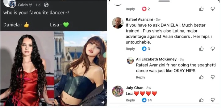 อย่างไรก็ตาม ความไม่พอใจของแฟน ๆ ปะทุขึ้นหนัก เมื่อมีการขุดคอมเมนต์เก่าที่ราฟาเอลเคยเขียนใต้โพสต์โพลเปรียบเทียบนักเต้นระหว่างดาเนียลากับลิซ่า โดยมีข้อความเชิงเหยียดเชื้อชาติว่า ดาเนียลาฝึกมาดีกว่า และความเป็น “ลาตินา” ทำให้ได้เปรียบเหนือแดนเซอร์เอเชีย คำพูดดังกล่าวสร้างความโกรธเคืองอย่างมากในหมู่แฟนเคป๊อป