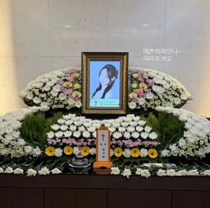 ภาพดังกล่าวเผยให้เห็นบรรยากาศงานศพที่เรียบง่าย มีการจัดดอกไม้และภาพของมิแร ยืนยันข่าวการเสียชีวิตที่สร้างความเสียใจให้กับแฟน ๆ