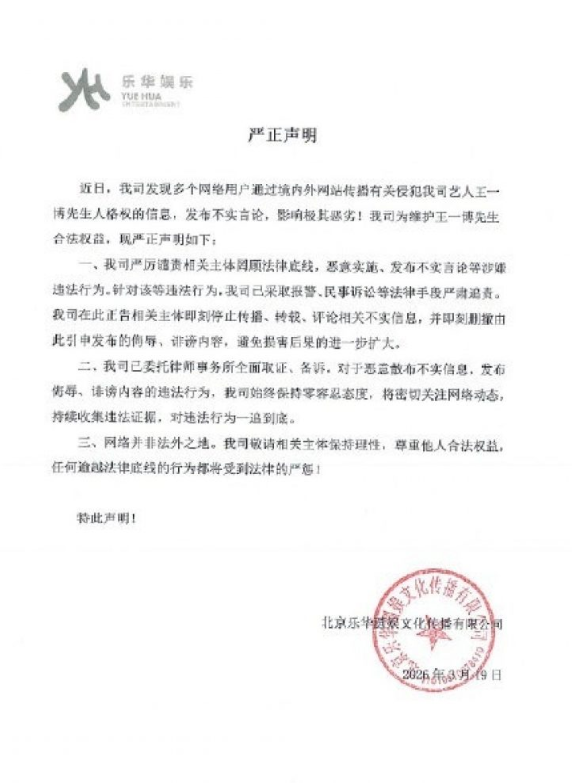 ล่าสุด บริษัท เยว่ฮวา เอนเตอร์เทนเมนต์ ต้นสังกัดของหวังอี้ป๋อ ออกแถลงการณ์ชี้แจงทันที ระบุว่ามีผู้ใช้งานอินเทอร์เน็ตทั้งในและต่างประเทศ เผยแพร่ข้อมูลเท็จและละเมิดสิทธิส่วนบุคคลของศิลปิน ซึ่งส่งผลกระทบร้ายแรง