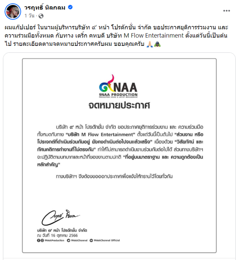 โดยทางเนื้อหาในจอหมายว่า บริษัท ๙ หน้า โปรดักชั่น จำกัด ขอประกาศยุติการร่วมงาน และ ความร่วมมือทั้งหมด กับทาง บริษัท M Flow Entertainment ตั้งแต่วันนี้เป็นต้นไป ส่วนงานหรือโปรเจกต์ที่ดำเนินร่วมกันอยู่ ยังคงดำเนินต่อไปจนเเล้วเสร็จ เนื่องด้วย วิสัยทัศน์และทัศนคติการทำงานที่ไม่ตรงกัน ทำให้ไม่สามารถดำเนินงานร่วมกันต่อไปได้