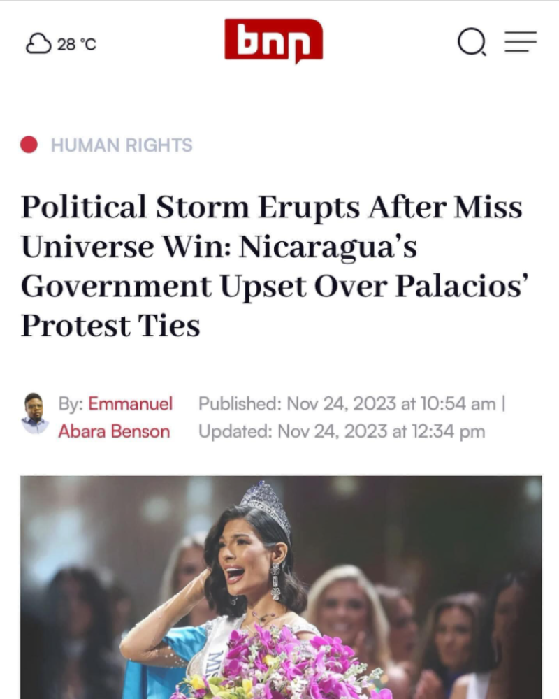 ล่าสุด ทางเพจดัง อย่าง บุญรอด เนล ปีเตอร์ จิระอนันต์ ได้ออกมาเผยข้อมูลว่ามีข่าวลือออกมาหนาหูว่ารัฐบาลของประเทศนิการากัวสั่งห้าม Sheynnis Palacios เหตุเพราะเธอเคยลงถนนประท้วงเมื่อปี 2018 โดยได้ระบุข้อความว่า เผด็จการทหาร Daniel Ortega กลัวประชาชนลุกฮือ เมื่อ นางงามจักรวาลคนใหม่ เคยลงถนนประท้วง