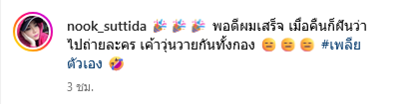 โดยโพสต์ภาพพร้อมข้อความว่า เมื่อถ่ายละครจบ และ แพลนว่าจะไม่รับละคร 1 ปี สิ่งแรกที่ทำ พอดีผมเสร็จ เมื่อคืนก็ฝันว่าไปถ่ายละคร เค้าวุ่นวายกันทั้งกอง #เพลียตัวเอง ท่ามกลางแฟนๆเข้ามาคอมเมนต์แซวในลุคผมสั้นกันอย่างมาก