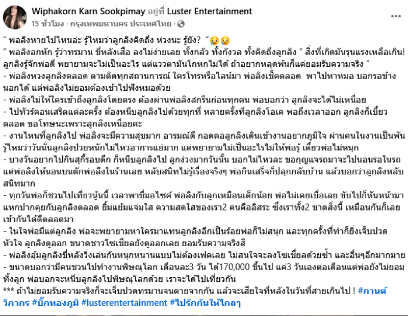 ทำเอาชาวเน็ตต่างคอมเมนต์กันสนั่นหลังทางด้าน กานต์ วิภากร ภรรยาเสก โลโซ ได้ออกมาโพสต์ข้อความตัดพ้อผ่านทางเฟซบุ๊คส่วนตัว Wiphakorn Karn Sookpimay โดยระบุว่า พ่อลิงหายไปไหนอ่ะ รู้ไหมว่าลูกลิงคิดถึง ห่วงนะ รู้ยัง? พ่อลิงอกหัก รู้ว่าทรมาน ขี่หลังเสือ ลงไม่ง่ายเลย ทั้งกลัว ทั้งกังวล ทั้งคิดถึงลูกลิง สิ่งที่เกิดมันรุนแรงเหลือเกิน