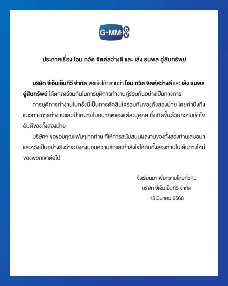 เรียกได้ว่า ทำเอาแฟนคลับใจหายไม่น้อย เมื่อทาง GMMTV ออกประกาศอย่างเป็นทางการเมื่อวันที่ 15 มีนาคม 2568 ที่ผ่ามา ว่า โอม ภวัต จิตต์สว่างดี และ เล้ง ธนพล อู่สินทรัพย์ ตัดสินใจยุติการทำงานร่วมกัน ล่าสุด ทางต้นสังกัดได้ประกาศการเปลี่ยนตัวนักแสดงในซีรีส์ที่ทั้งคู่เคยมีรายชื่อแสดง โดยมีรายละเอียดดังนี้