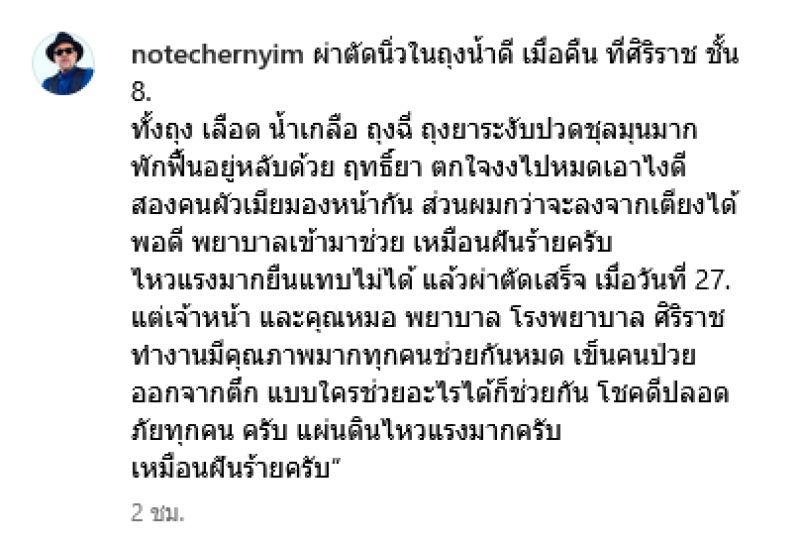 เรียกได้ว่าเป็นอีกหนึ่งนักแสดงตลกและพิธีกรรุ่นใหญ่สำหรับ โน้ต เชิญยิ้ม โดยเจ้าตัวเพิ่งได้เข้ารับการผ่าตัด หลังได้ตรวจพบปัญหาสุขภาพเกี่ยวกับ นิ่วในถุงน้ำดี ที่ได้ผ่าตัดนานกว่า 6 ชั่วโมง ทั้งนี้ยังได้เกิดเหตุการณ์แผ่นดินไหวอีกด้วย โดย โน้ต เชิญยิ้ม ได้โพดสต์อัปเดตสถานการณ์ผ่านทางอินสตราแกรม notechernyim