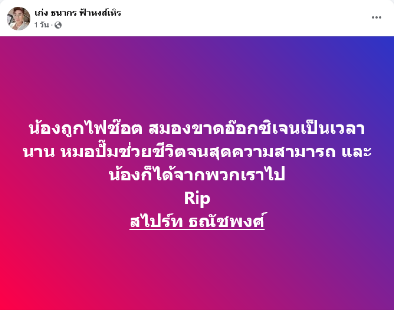 ทั้งนี้ยังได้ออกมาเผยสาเหตุการเสียชีวิตของ สไปร์ท ธณัชพงศ์ ว่า น้องถูกไฟช๊อต สมองขาดอ๊อกซิเจนเป็นเวลานาน หมอปั๊มช่วยชีวิตจนสุดความสามารถ และน้องก็ได้จากพวกเราไป Rip สไปร์ท ธณัชพงศ์
