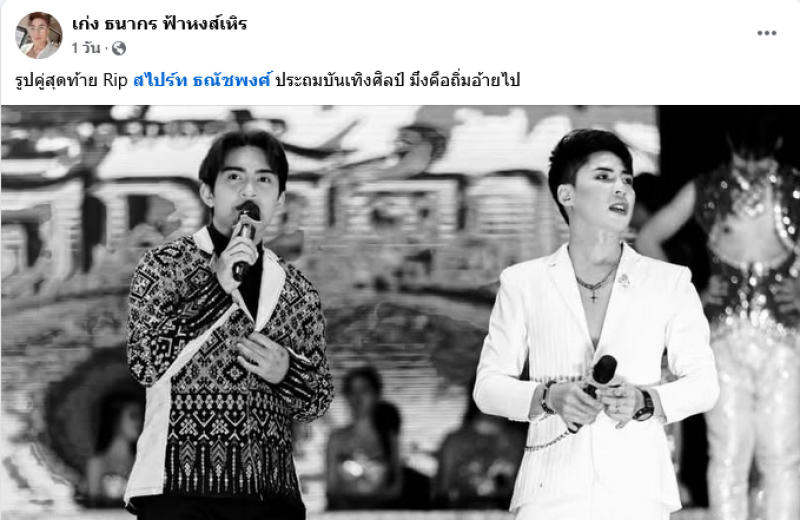 ทำเอาแฟนๆในวงการหมอลำต่างใจหายกันมากสำหรับการจากไปของ สไปร์ท ธณัชพงศ์ หมอลำ สังกัดประถมบันเทิงศิลป์ โดยทางด้านเฟซบุ๊ก เก่ง ธนากร ฟ้าหงส์เหิร ได้ออกมาโพสต์อาลัย ระบุว่า รูปคู่สุดท้าย Rip สไปร์ท ธณัชพงศ์ ประถมบันเทิงศิลป์ xึงคือถิ่มอ้ายไป