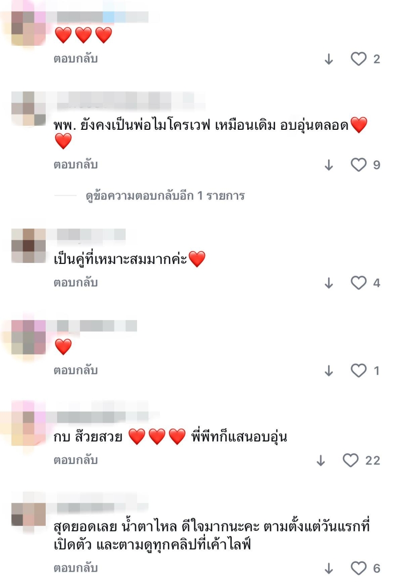 งานนี้ทำเอาแฟนๆ แห่เข้ามาคอมเมนต์แซวกันอย่างรัวๆ เช่น พพ. ยังคงเป็นพ่อไมโครเวฟ เหมือนเดิม อบอุ่นตลอด , เป็นคู่ที่เหมาะสมมากค่ะ , กบ ส๊วยสวย พี่พีทก็แสนอบอุ่น , สุดยอดเลย น้ำตาไหล ดีใจมากนะคะ ตามตั้งแต่วันแรกที่เปิดตัว และตามดูทุกคลิปที่เค้าไลฟ์ เป็นต้น