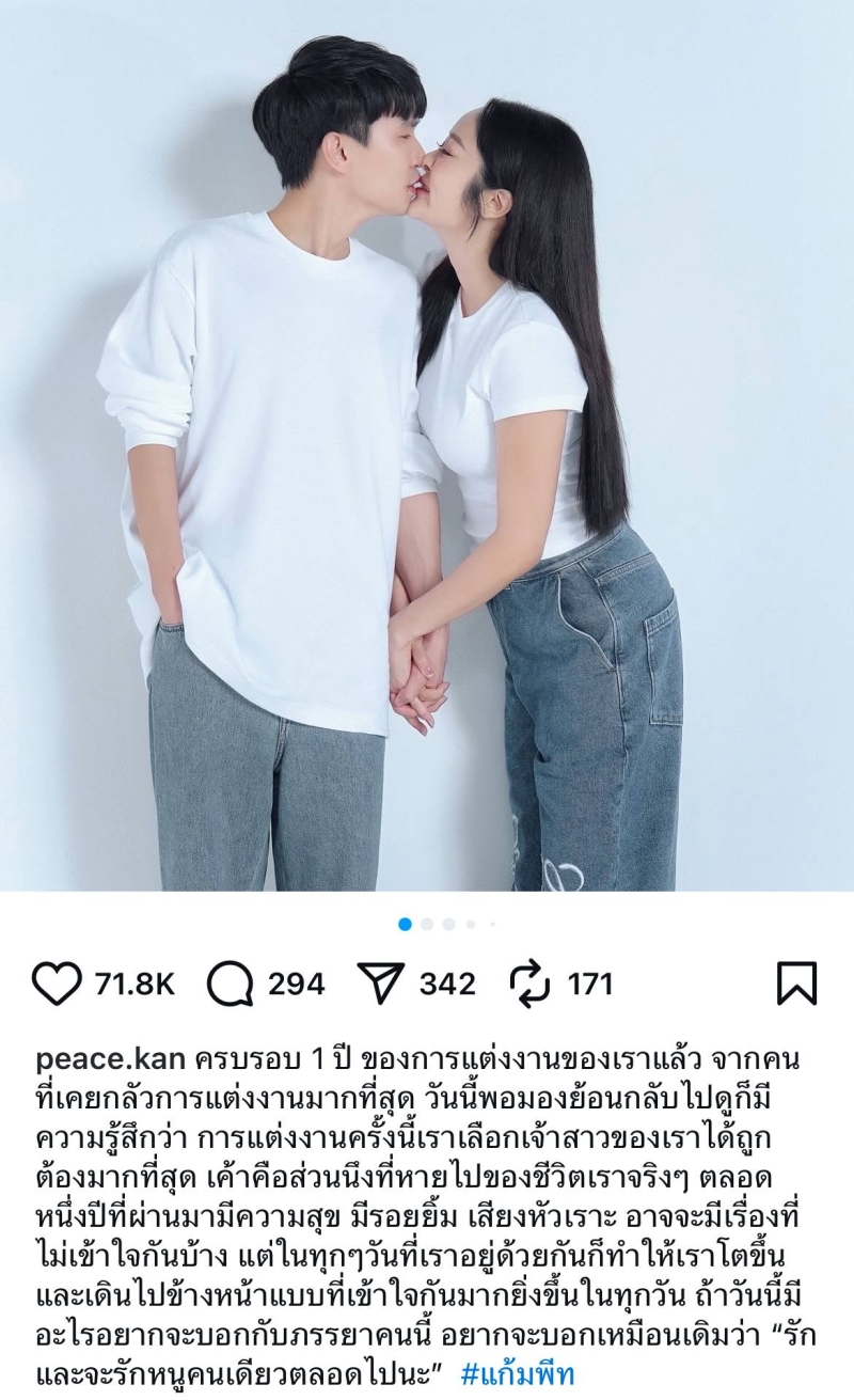 แถมยังเผยอีกว่า ตลอดหนึ่งปีที่ผ่านมามีความสุข มีรอยยิ้ม เสียงหัวเราะ อาจจะมีเรื่องที่ไม่เข้าใจกันบ้าง แต่ในทุกๆ วันที่เราอยู่ด้วยกันก็ทำให้เราโตขึ้น และเดินไปข้างหน้าแบบที่เข้าใจกันมากยิ่งขึ้นในทุกวัน ถ้าวันนี้มีอะไรอยากจะบอกกับภรรยาคนนี้ อยากจะบอกเหมือนเดิมว่า "รักและจะรักหนูคนเดียวตลอดไปนะ" #แก้มพีท