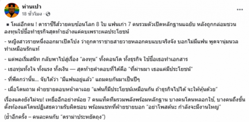 เพจดังอย่าง ท่านเปา ได้ออกมาโพสต์เเฉดาราซีรีส์วายคบซ่อนมีโลก 8 ใบ โดยระบุว่าโผล่อีกคน ! ดาราซีรีส์วายคบซ้อนโลก 8 ใบ แฟนเก่า 7 คนรวมตัวเปิดหลักฐานแฉยับ หลังถูกกล่อมชวนลงทุนใช้ชื่อทำธุรกิจสุดท้ายอ้างแค่คบเพราะผลประโยชน์
