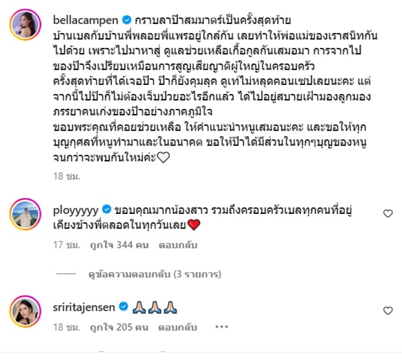 โดยทางเบลล่าเอง ก็ได้โพสต์ลาลัยเป็นครั้งสุดท้าย ว่า กราบลาป๊าสมมาตร์เป็นครั้งสุดท้าย บ้านเบลกับบ้านพี่พลอยพี่แพรอยู่ใกล้กัน เลยทำให้พ่อแม่ของเราสนิทกันไปด้วย เพราะไปมาหาสู่ ดูแลช่วยเหลือเกื้อกูลกันเสมอมา การจากไปของป๊าจึงเปรียบเหมือนการสูญเสียญาติผู้ใหญ่ในครอบครัว ครั้งสุดท้ายที่ได้เจอป๊า ป๊าก็ยังคุมลุค ดูเท่ไม่หลุดคอนเซปเลยนะคะ แต่จากนี้ไปป๊าก็ไม่ต้องเจ็บป่วยอะไรอีกแล้ว ได้ไปอยู่สบายเฝ้ามองลูกมองภรรยาคนเก่งของป๊าอย่างภาคภูมิใจ ขอบพระคุณที่คอยช่วยเหลือ ให้คำแนะนำหนูเสมอนะคะ และขอให้ทุกบุญกุศลที่หนูทำมาและในอนาคต ขอให้ป๊าได้มีส่วนในทุกๆบุญของหนู จนกว่าจะพบกันใหม่ค่ะ