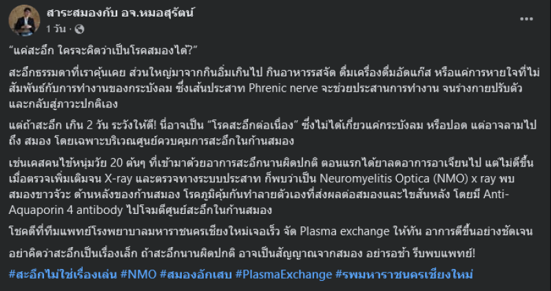 โชคดีที่ทีมแพทย์โรงพยาบาลมหาราชนครเชียงใหม่เจอเร็ว จัด Plasma exchange ให้ทัน อาการดีขึ้นอย่างชัดเจน อย่าคิดว่าสะอึกเป็นเรื่องเล็ก ถ้าสะอึกนานผิดปกติ อาจเป็นสัญญาณจากสมอง อย่ารอช้า รีบพบแพทย์!
