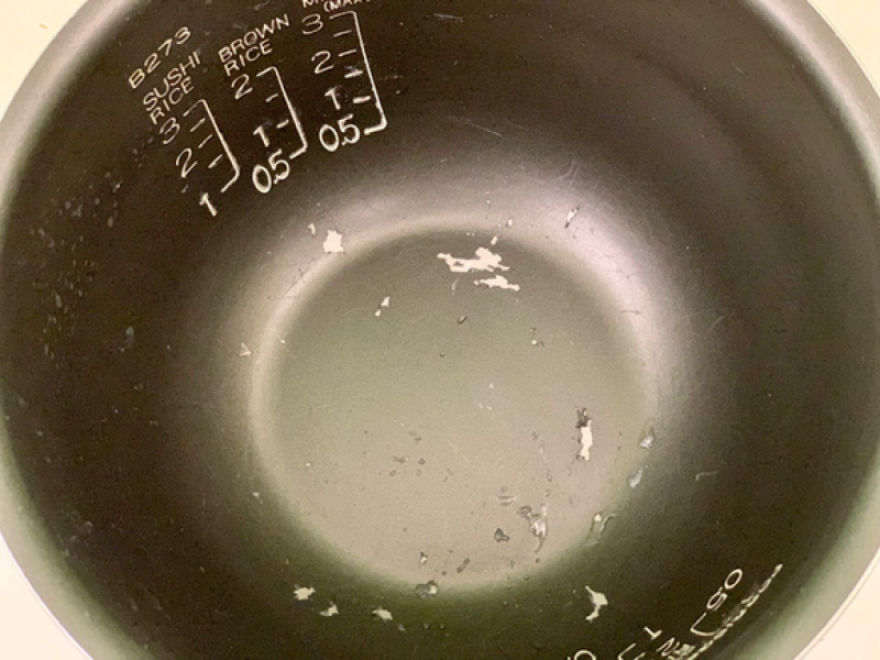1. ใช้หม้อหุงข้าวที่เคลือบกันติดหลุดลอกหรือมีรอยขีดข่วนเยอะ
