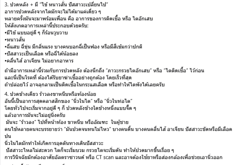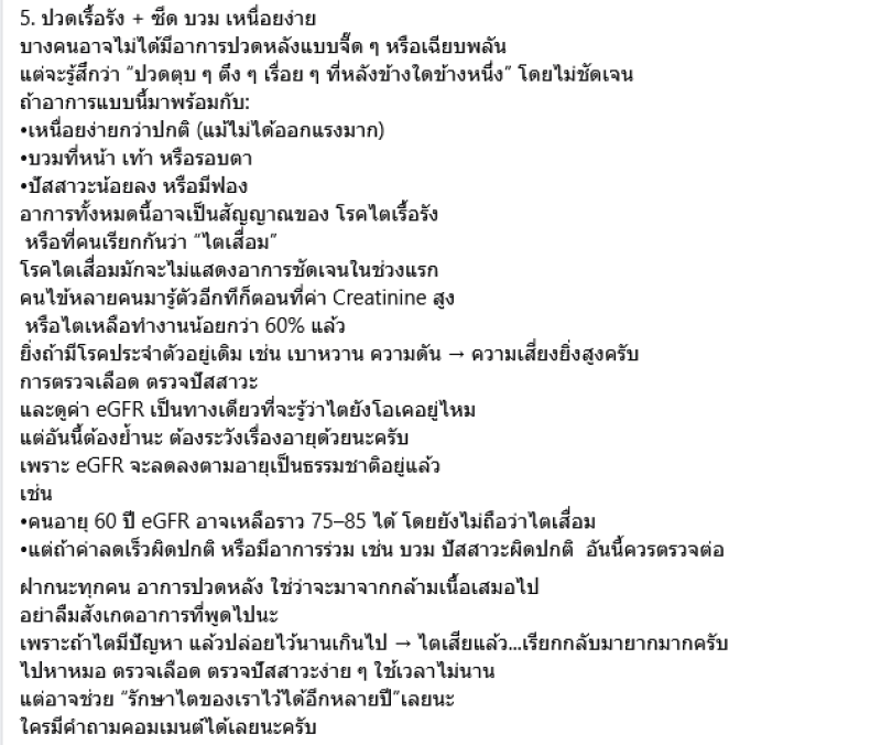 บางคนอาจไม่ได้มีอาการปวดหลังแบบจี๊ดๆ หรือเฉียบพลัน แต่จะรู้สึกว่า ปวดตุบๆ ตึงๆ เรื่อยๆ ที่หลังข้างใดข้างหนึ่ง โดยไม่ชัดเจน ถ้าอาการแบบนี้มาพร้อมกับ เหนื่อยง่ายกว่าปกติ (แม้ไม่ได้ออกแรงมาก),บวมที่หน้า เท้า หรือรอบตา,ปัสสาวะน้อยลง หรือมีฟอง อาการทั้งหมดนี้อาจเป็นสัญญาณของ โรคไตเรื้อรัง หรือที่คนเรียกกันว่า ไตเสื่อม