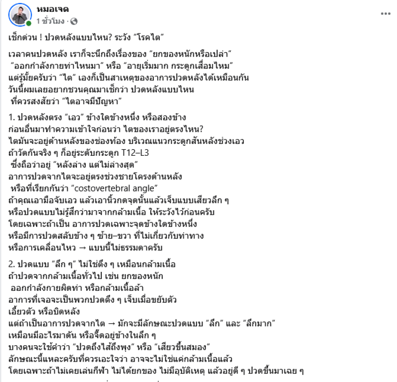 ล่าสุดหมอเจด นพ.เจษฎ์ บุณยวงศ์วิโรจน์ รองผู้อำนวยการโรงพยาบาลมหาราช นครราชสีมา ได้ออกมาโพสต์ข้อความระบุว่า เวลาคนปวดหลัง เราก็จะนึกถึงเรื่องของ ยกของหนักหรือเปล่า ออกกำลังกายท่าไหนมา หรือ อายุเริ่มมาก กระดูกเสื่อมไหม แต่รู้มั้ยครับว่า ไต เองก็เป็นสาเหตุของอาการปวดหลังได้เหมือนกัน