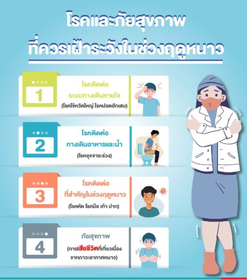 ควรระมัดระวังในช่วงฤดูหนาว ในช่วงเดือนตุลาคมถึงกุมภาพันธ์ของทุกปี ประเทศไทยจะเข้าสู่ฤดูหนาว ซึ่งบางพื้นที่จะมีอุณหภูมิลดลงอย่างต่อเนื่องโดยเฉพาะจังหวัดในพื้นที่ภาคเหนือ และภาคตะวันออกเฉียงเหนือ อากาศที่หนาวเย็นอาจทำให้ร่างกายปรับตัวไม่ทัน เสี่ยงเจ็บป่วยได้ง่าย จึงขอให้หมั่นดูแลร่างกายให้อบอุ่นและแข็งแรงอยู่เสมอ เพื่อลดโอกาสที่จะเจ็บป่วยจากโรคและภัยสุขภาพ โดยแบ่งเป็น 4 กลุ่ม
