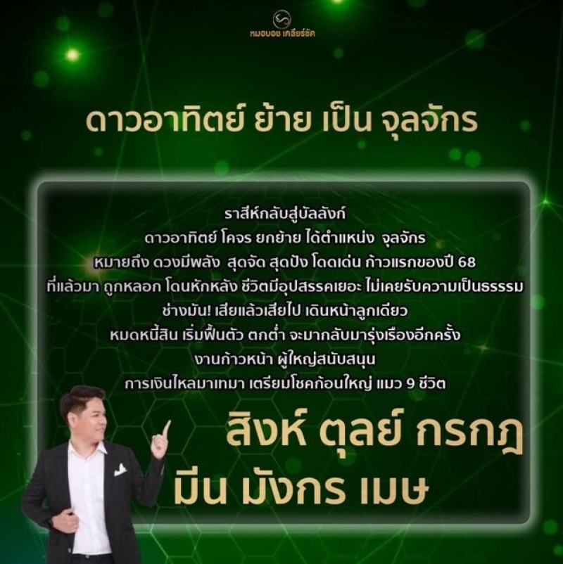 วันที่ 15 ม.ค. 68 ทางหมอบอย เคลียร์ชัด นักดูดวงและราศี ได้ เปิดชะตา 6 ราศี ดาวอาทิตย์ย้ายเป็นจุลจักร หมดหนี้สิน เริ่มฟื้นตัว จะกลับมารุ่งเรืองอีกครั้ง งานก้าวหน้า การเงินไหลมาเทมา ประกอบด้วย ราศีสิงห์ ราศีตุลย์ ราศีกรกฎ ราศีมีน ราศีมังกร และ ราศีเมษ