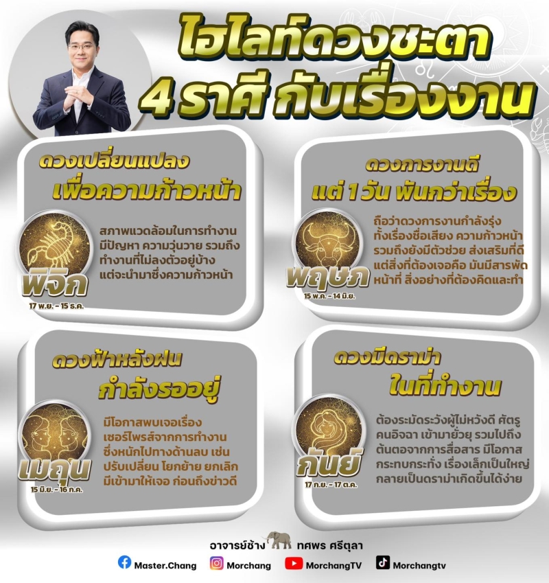 วันที่ 19 ก.พ. 67 ที่ผ่านมา หมอช้าง ทศพร ศรีตุลา หมอดูชื่อดัง ได้เผยคำทำนาย 4 ราศี อาจเกิดการเปลี่ยนแปลง ทั้งในเรื่องที่ดี และเรื่องที่ต้องระวัง บางราศีอาจมีเซอร์ไพรส์ ดวงฟ้าหลังฝน จะมีราศีใดบ้าง