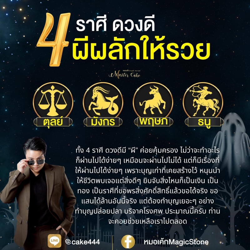 หมอเค้กMagic stone เผยถึงดวงชะตา ดวงดี ผีผลักให้รวย โดยราศีนี้ดวงดีมีผีคอยคุ้มครอง ไม่ว่าจะทำอะไร ก็ผ่านไปได้ง่ายๆ เหมือนจะผ่านไปไม่ได้ แต่ก็มีเรื่องที่ให้ผ่านไปได้ง่ายๆ เพราะบุญเก่าที่เคยสร้างไว้ หนุนนำให้ชีวิตพบเจอแต่สิ่งดีๆ หยิบจับสิ่งใดก็เป็นเงินเป็นทอง เป็นราศีที่ขอพรสิ่งศักดิ์สิทธิ์แล้วขอได้จริง ขอแสนได้ล้าน แต่ต้องทำบุญเยอะๆ อย่างปล่อยปลา บริจาคโลงศพ
