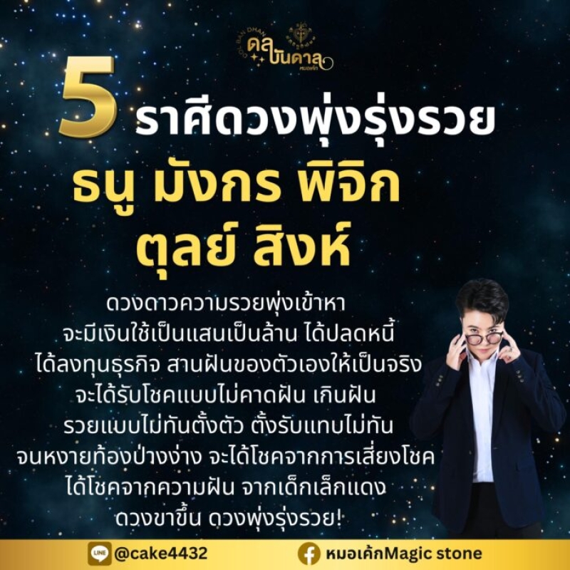 หมอเค้ก Magic stone หมอดูชื่อดัง เปิด 5 ราศีดวงรุ่งพุ่งรวย ดวงขาขึ้น รวยแบบไม่ทันตั้งตัว ได้โชคแบบไม่คาดฝัน ดวงความรวยพุ่งเข้าหา จะมีเงินใช้เป็นแสนเป็นล้าน ได้ปลดหนี้