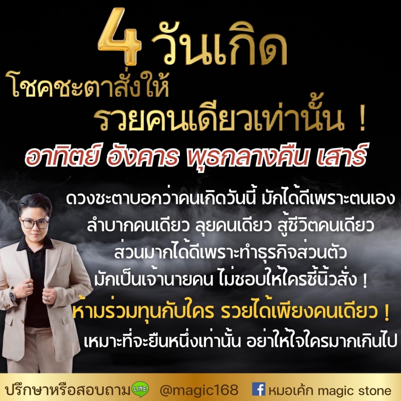หมอเค้กMagic stone เผยถึงดวงชะตา 4 วันเกิด โชคชะตาสั่งให้รวยคนเดียวเท่านั้น ดวงชะตา บอกว่าคนเกิดวันนี้มักได้ดีเพราะตนเอง ลำบากคนเดียว ลุยคนเดียว สู้ชีวิตคนเดียว ส่วนมากได้ดีเพราะธุรกิจส่วนตัว มักเป็นเจ้านายคน ไม่ชอบให้ใครชี้นิ้วสั่ง ห้ามร่วมทุนกับใคร รวยได้เพียงคนเดียว เหมาะที่จะยืนหนึ่งเท่านั้น