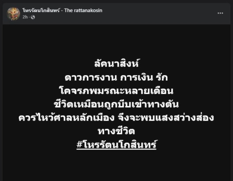 เมื่อวันที่ 3 มี.ค. 68 ที่ผ่านมาก โหรรัตนโกสินทร์ โพสต์เฟซบุ๊ก โหรรัตนโกสินทร์ - The rattanakosin ได้ออกมาเผยดวงวันนี้ ผ่านเฟซบุ๊ก ว่า ลัคนาสิงห์ ดาวการงาน การเงิน รัก โคจรภพมรณะหลายเดือน ชีวิตเหมือนถูกบีบเข้าทางตัน ควรไหว้ศาลหลักเมือง จึงจะพบแสงสว่างส่องทางชีวิต