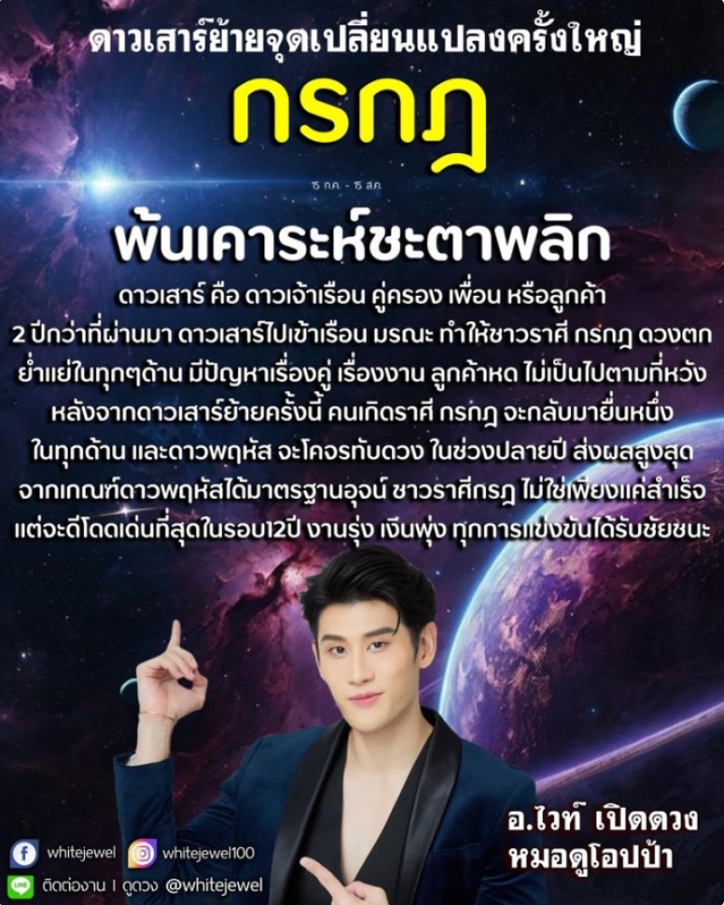 หลังจากดาวเสาร์ย้ายครั้งนี้ คนเกิดราศีกรกฎจะกลับมายืนหนึ่งในทุกด้าน และดาวพฤหัสจะโคจรทับดวงในช่วงปลายปี ส่งผลสูงสุด จากเกณฑ์ดาวพฤหัสได้มาตรฐานอุจจ์ ชาวราศีกรกฎไม่ใช่เพียงแค่สำเร็จ แต่จะดีโดดเด่นที่สุดในรอบ 12 ปี งานรุ่ง เงินพุ่ง ทุกการแข่งขันได้รับชัยชนะ