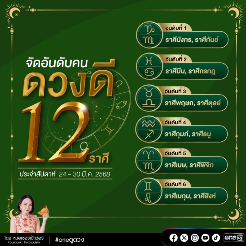 เมื่อวันที่ 24 มี.ค. 68 ทางเพงดัง Horosociety หมอเชอร์ เป๊ะเว่อร์ นักโหราศาสตร์ชื่อดังและดูดวง ได้จัดจัดอันดับคนดวงดี 12 ราศี ประจำสัปดาห์ 24 – 30 มีนาคม 2568