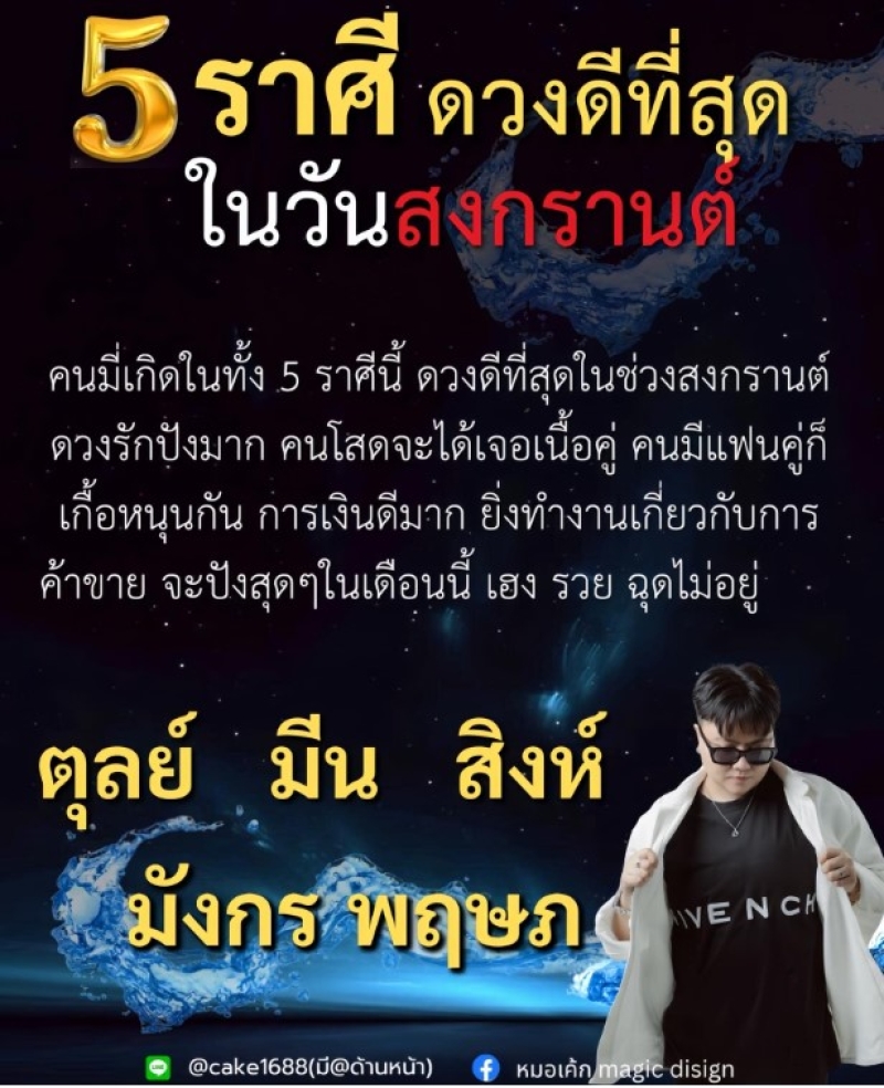 วันที่ 7 เม.ษ. 68 หมอเค้กMagic stone เผยถึงดวงชะตาราศี ดวงดีที่สุดในวันสงกรานต์ ดวงรักปังมาก คนโสดจะได้เจอเนื้อคู่ คนมีแฟนมีคู่ก็เกื้อหนุนกัน การเงินดีมาก ยิ่งทำงานเกี่ยวกับค้าขายจะปังสุดๆ ในเดือนนี้ เฮง รวย ฉุดไม่อยู่