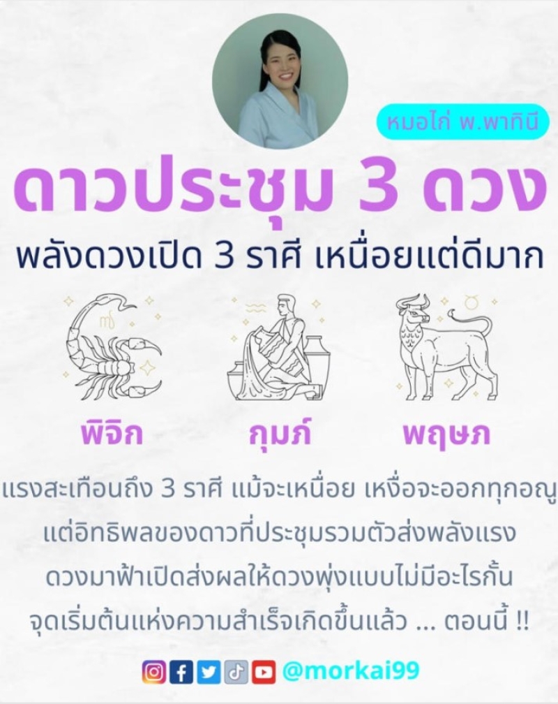 3 ราศี เหนื่อยแต่ดีมาก แรงสะเทือนถึง 3 ราศี แม้จะเหนื่อย เหงื่อจะออกทุกอณู แต่อิทธิพลของดาวที่ประชุมรวมตัวส่งพลังแรง ดวงมาฟ้าเปิดส่งผลให้ดวงพุ่งแบบไม่มีอะไรกั้น จุดเริ่มต้นแห่งความสำเร็จเกิดขึ้นแล้ว ตอนนี้! ซึ่งได้แก่ ราศีพิจิก ราศีกุมภ์ ราศีพฤษภ