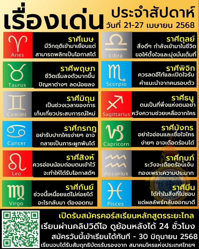 เปิดคำทำนาย 12 ราศี ประจำสัปดาห์ที่ 21-27 เมษายน 2568 โดยทางด้าน สมาคมโหรแห่งประเทศไทย ในพระบรมราชินูปถัมภ์ พบราศีต้องระวัง จะเดือดร้อนเรื่องเงินทอง เพราะความประมาท นั่นคือ ราศีกุมภ์ ระวังจะเดือดร้อนเงินทองเพราะความประมาท